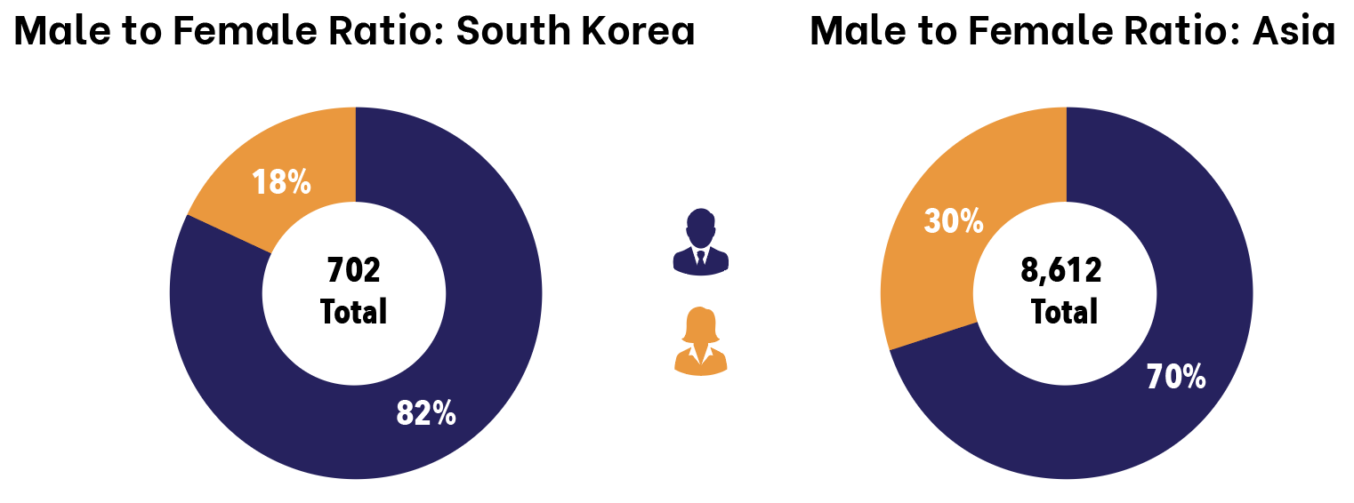 The national average male-to-female ratio for South Korea law firms is 82 to 18 percent, which, as can be seen from the charts, is well below the overall Asia average of 70 to 30 percent.